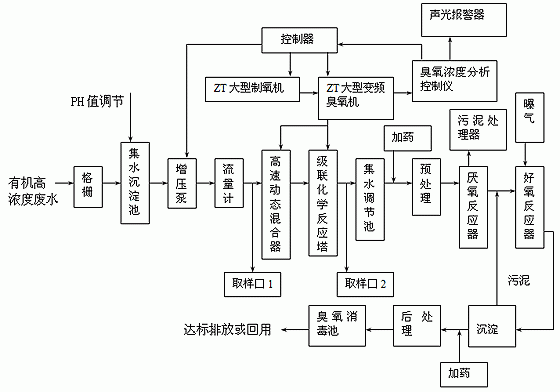 某化工廠每小時(shí)排放約15m?的復(fù)合型工業(yè)廢水(其中廢水成分及含量:苯胺含量1400mg/L,硝基苯400mg/L,氯苯200mg/L,多胺100mg/L,甲醛100mg/L,苯50mg/L,COD5000mg/L),含有高色度、高毒性、高COD、難生化特征,水處理工藝過程為該有機(jī)復(fù)合型廢水經(jīng)過格柵和集水沉淀池濾除水中漂浮物和懸浮固體,經(jīng)流量20m?/h,揚(yáng)程30m的管道增壓泵增壓,經(jīng)過轉(zhuǎn)子流量計(jì)量進(jìn)入高速動(dòng)態(tài)混合器進(jìn)行臭氧與廢水高效氣液混合成霧狀提高臭氧與廢水中污物的接觸面積和反應(yīng)機(jī)率有利提高臭氧的溶解率和利用率,ZT大型制氧機(jī)和大型ZT變頻臭氧機(jī)生產(chǎn)出濃度不低于40mg/L的大產(chǎn)率臭氧分別注入高速動(dòng)態(tài)混合器和級(jí)聯(lián)化學(xué)反應(yīng)塔進(jìn)行反應(yīng)。臭氧接觸塔為不銹鋼材質(zhì),內(nèi)部裝有可拆卸式鈦粉末燒結(jié)而成的微米級(jí)鈦板多孔氣體擴(kuò)散器,采用氣液逆向接觸有利于臭氧氣體進(jìn)入液相中,通常接觸氧化時(shí)間長(zhǎng)的水處理裝置需用,盡管現(xiàn)代一些新型混合設(shè)備已出現(xiàn),但在某些狀況下又不能全取代氧化塔。從氧化塔視鏡可觀察到反應(yīng)氣泡大小、密度及顏色等情況。廢水經(jīng)過約5~10分鐘的快速及強(qiáng)氧化反應(yīng)過程,可使高濃度難降解高濃度有機(jī)物廢水達(dá)到絮凝、脫色、除臭效果、并降解為可直接生化的新有機(jī)物匯入集水調(diào)節(jié)池(同時(shí)也有部分反應(yīng)生成物直接變成CO2氣體逸出),從廢水取樣口1和取樣口2可隨時(shí)觀測(cè)廢水與臭氧反應(yīng)前后對(duì)比情況。后續(xù)處理工藝為厭氧和好氧相結(jié)合的傳統(tǒng)生化工藝,可將廢水中呈膠體和溶解狀態(tài)的有機(jī)污染物質(zhì)去除,COD和BOD去除率可達(dá)90%以上,經(jīng)進(jìn)一步臭氧消毒和沉淀砂濾工藝可進(jìn)一步實(shí)現(xiàn)污水達(dá)標(biāo)排放和回用,達(dá)到污水資源化目的。通過上述工藝處理前后廢水指標(biāo)對(duì)照表。